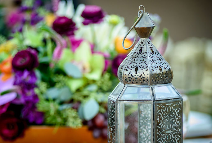 Guests dined atop ornate, gilded chairs at long King’s tables draped in an autumnal, rusted sheen linen. At each setting, gold-dipped flatware, an intricate pebbled charger, poppy silk napkin + a raspberry silhouetted menu card contributed to an air of regal formality. Footed compotes overflowed with an exotic abundance of blooms + fresh fruit while the eclectic collection of gilded lanterns + Moroccan tea glass votives casted their golden glow as night fell.